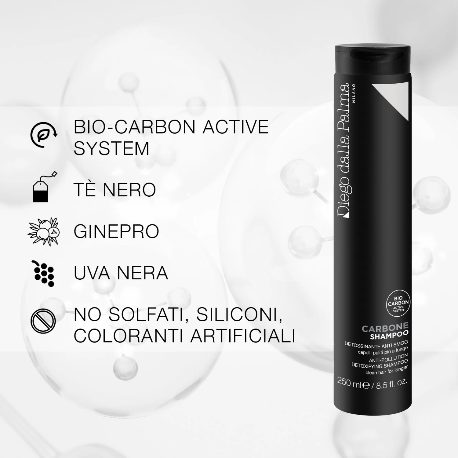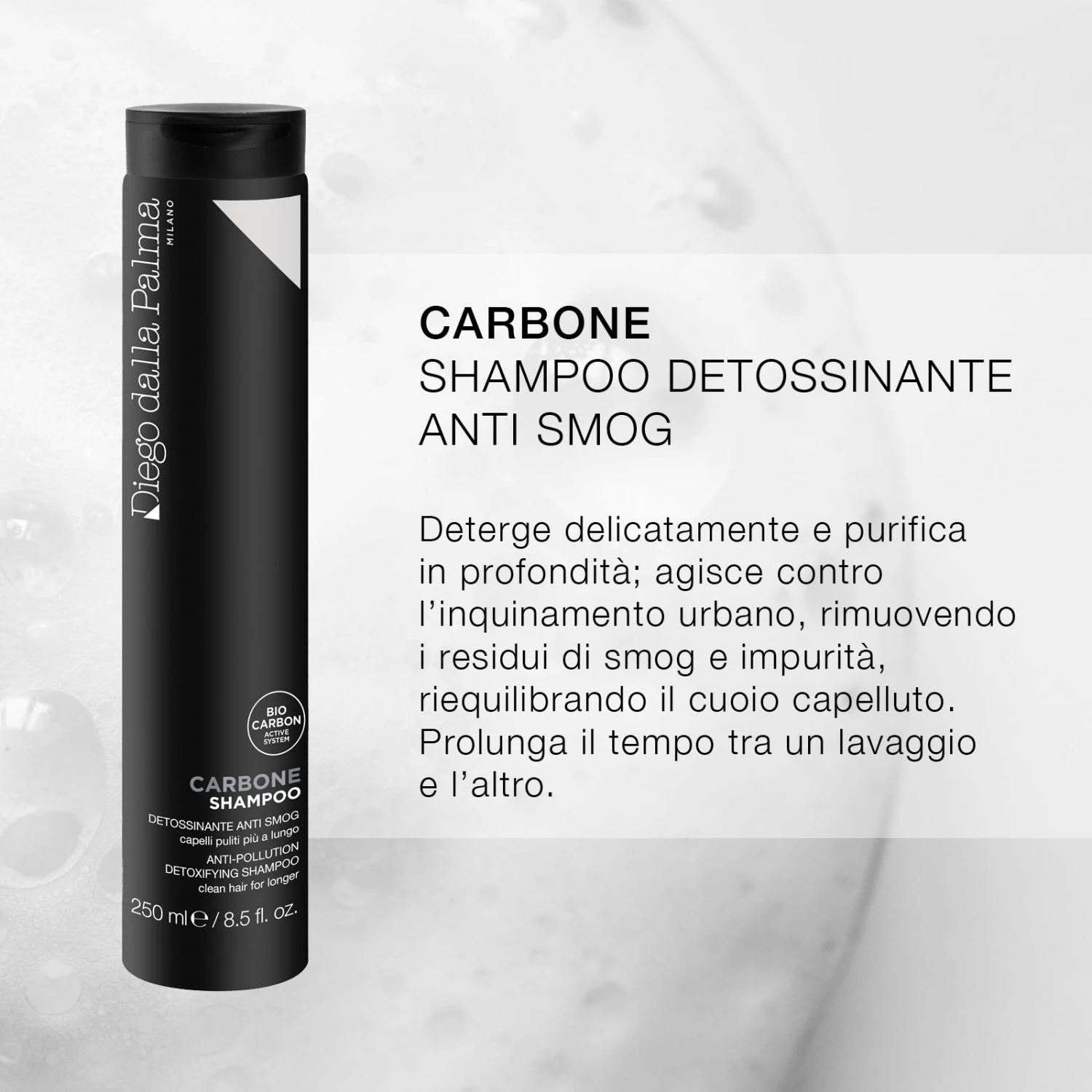 Shampoo nero al carbone attivo, deterge delicatamente e purifica in profondità, mantenendo le punte nutrite. Grazie al BIO-CARBON ACTIVE SYSTEM, derivato dal bamboo, agisce contro l’inquinamento urbano, rimuove i residui di smog e impurità, riequilibrando il cuoio capelluto. Prolunga il tempo tra un lavaggio e l’altro. Per capelli vitali e puri.