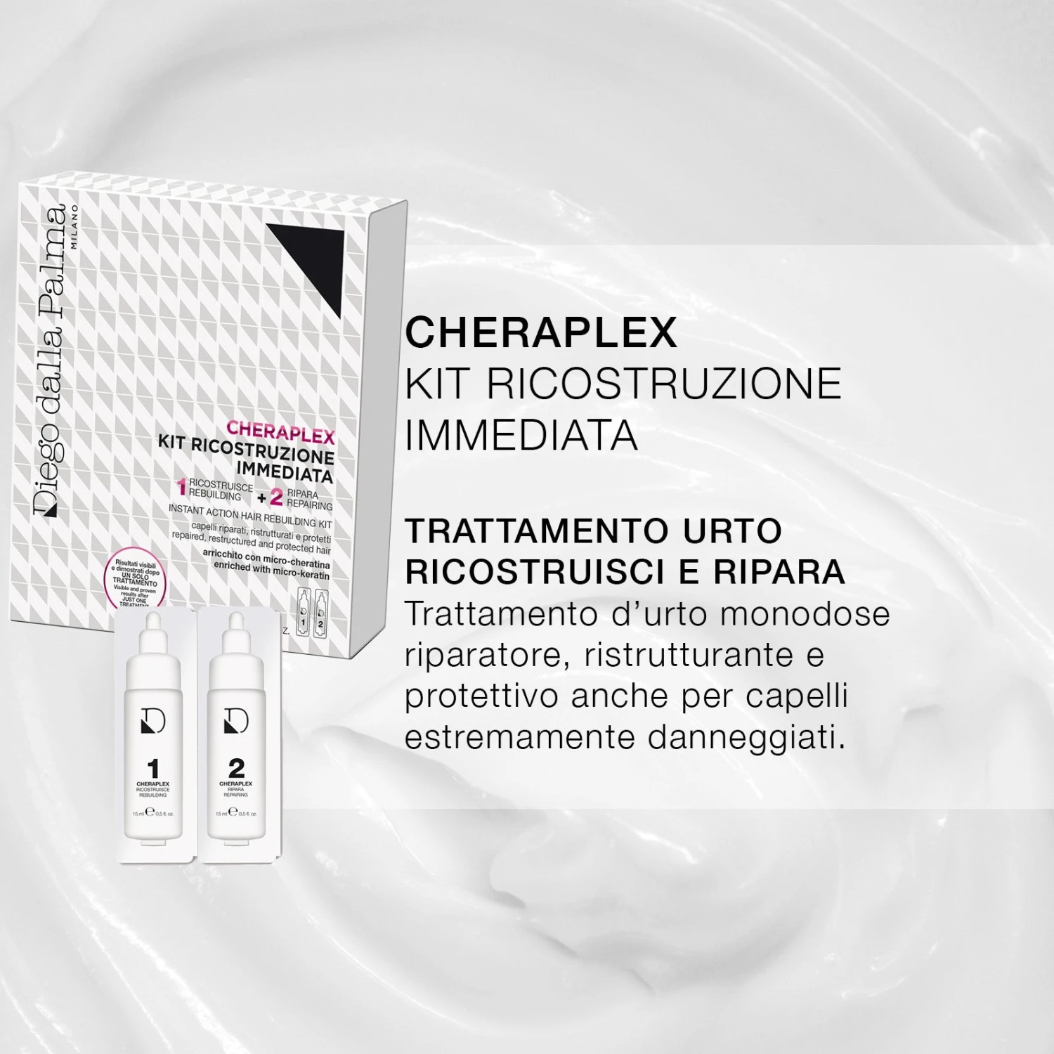 La FASE 1 penetra all’interno delle cuticole del capello dove ripara e previene i danni dall’interno. Ricostruisce e protegge i ponti disolfuro, fondamentali per mantenere integra la struttura del capello.