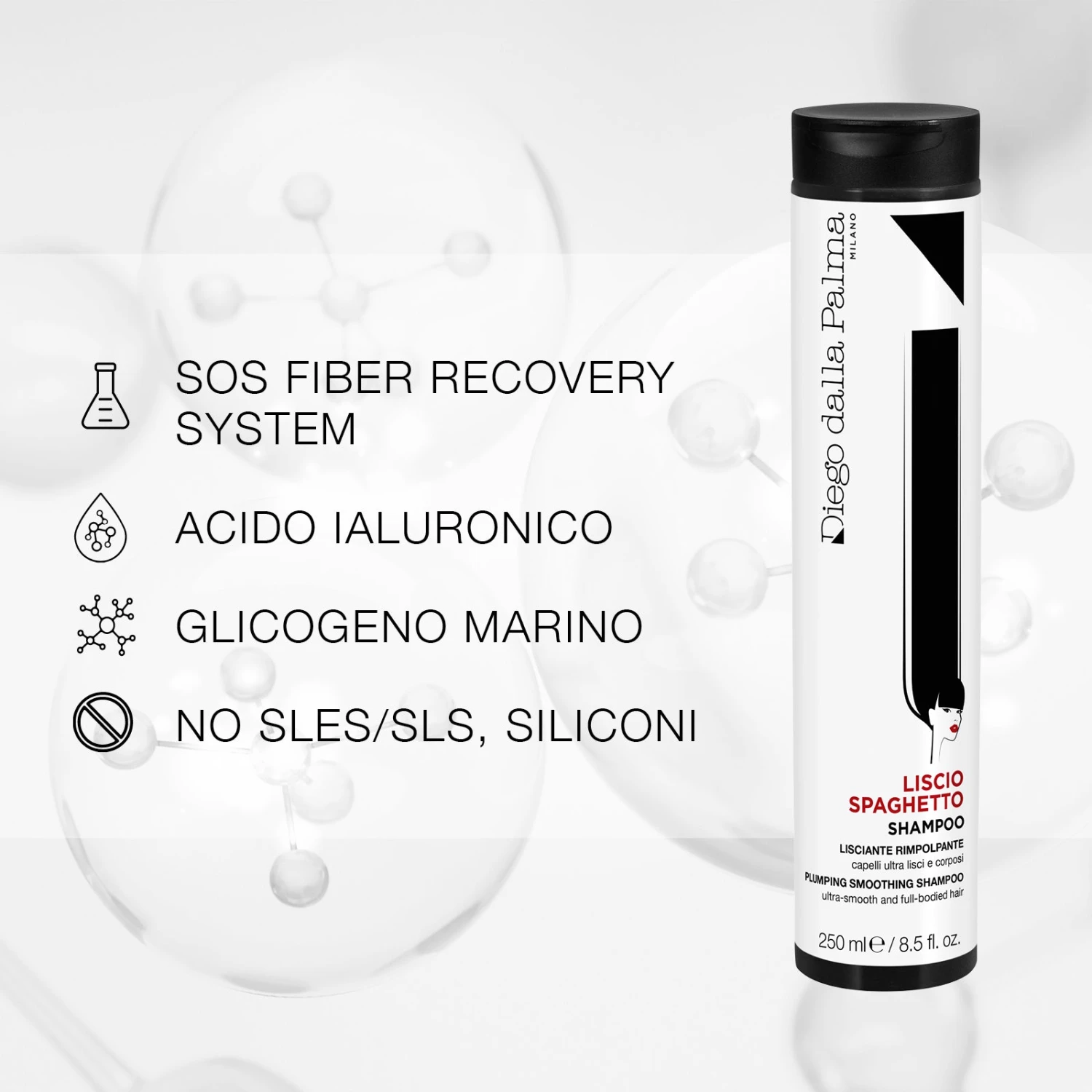 – SHAMPOO LISCIANTE RIMPOLPANTE: uno shampoo trattamento ad effetto rinforzante e anti stress che ripara le fibre e le rimpolpa aumentando spessore e lucentezza dei capelli. Per un liscio perfetto senza increspature che dura più giorni, in ogni circostanza.